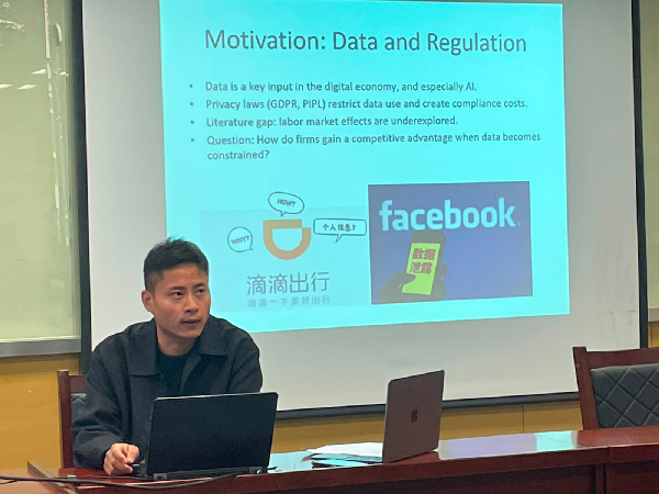 李从刚副教授分享的主题是“当AI遇见隐私,谁是赢家?——来自我国《个人信息保护法》的经验证据”。在数字经济时代,数据既是生产要素,也是AI的“燃料”。然而,随着《个人信息保护法》的实施,企业对数据的搜集和使用受到严格约束。研究基于中国上市公司数据,揭示隐私规制如何重塑企业的要素投入结构与竞争路径。研究发现,数据规制促使企业从依赖算法与大数据的“数据驱动型”模式,转向以技能劳动与研发创新为核心的“创新驱动型”模式。