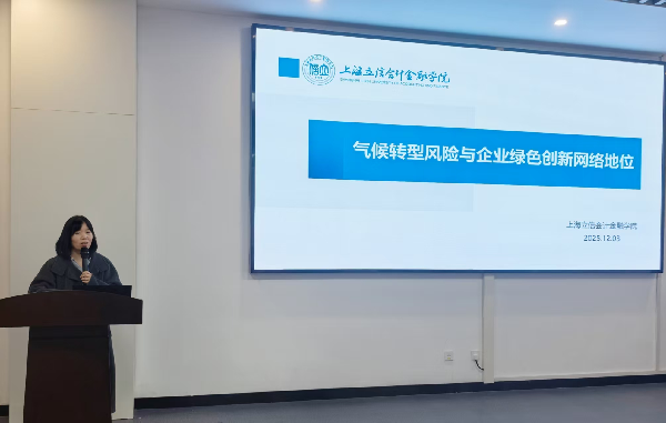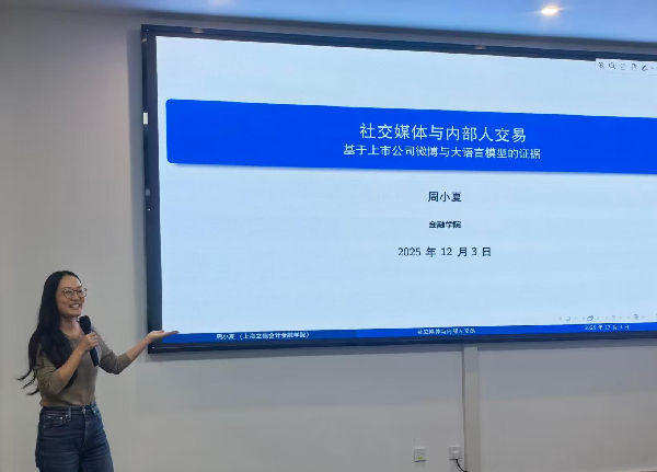 韩云作了题为“气候转型风险与企业绿色创新网络地位”的报告。她结合机器学习与复杂网络分析等方法,系统分析了气候转型风险对企业绿色创新网络地位的影响及传导路径,并通过验证新环保法、碳交易市场政策的联动效应,揭示了转型风险冲击可通过影响绿色创新网络地位,促进突破式创新、培育新质生产力。该研究为企业应对转型风险、推动复杂网络环境下的绿色创新,提供了实证依据与决策参考。金融学院周小夏进行点评。 交流研讨环节,参会师生就气候风险度量指标的构建等相关问题同三位老师进行了讨论交流。此次交流不仅深化了在场师生对AI赋能交叉学科应用的理解,为交叉学科间的互通和融合提供了新的思路。 上海立信会计金融学院AI赋能交叉学科沙龙由学科建设处主办,通过搭建AI赋能学科交叉平台,为学校不同学科背景的教师提供一个自由、开放的交流平台,鼓励教师展开深入探讨,挖掘新的研究领域和方向,促成交叉学科团队协作,促进交叉学科团队建设,推动AI赋能学科的交叉融合与创新发展。本次沙龙由金融学院、马克思主义研究院和马克思主义学院共同承办。 供稿:金融学院 供图:屠谦蕙